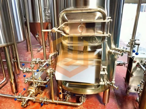 過濾槽與旋沉罐:采用上下兩層的設(shè)計方式,整體占地面積小,過濾槽采用銑制篩板,頂部采用異型人孔設(shè)計,側(cè)面配有出糟口,方形人孔門設(shè)計更有利于啤酒麥糟的清理工作,同時還配有出糟板。內(nèi)部配有耕刀裝置,用于疏松麥糟層以及出糟使用。